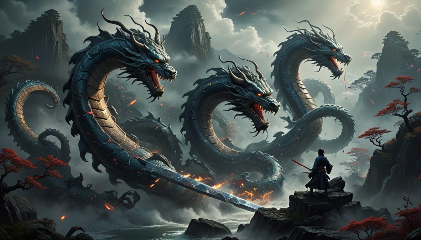 When the time came, the earth began to shake. The trees bent and swayed, though there was no wind. Then, from between the mountains, it came—Yamata no Orochi, its eight heads swaying like massive serpents rising from the ground, each one seeking, searching, hungry.